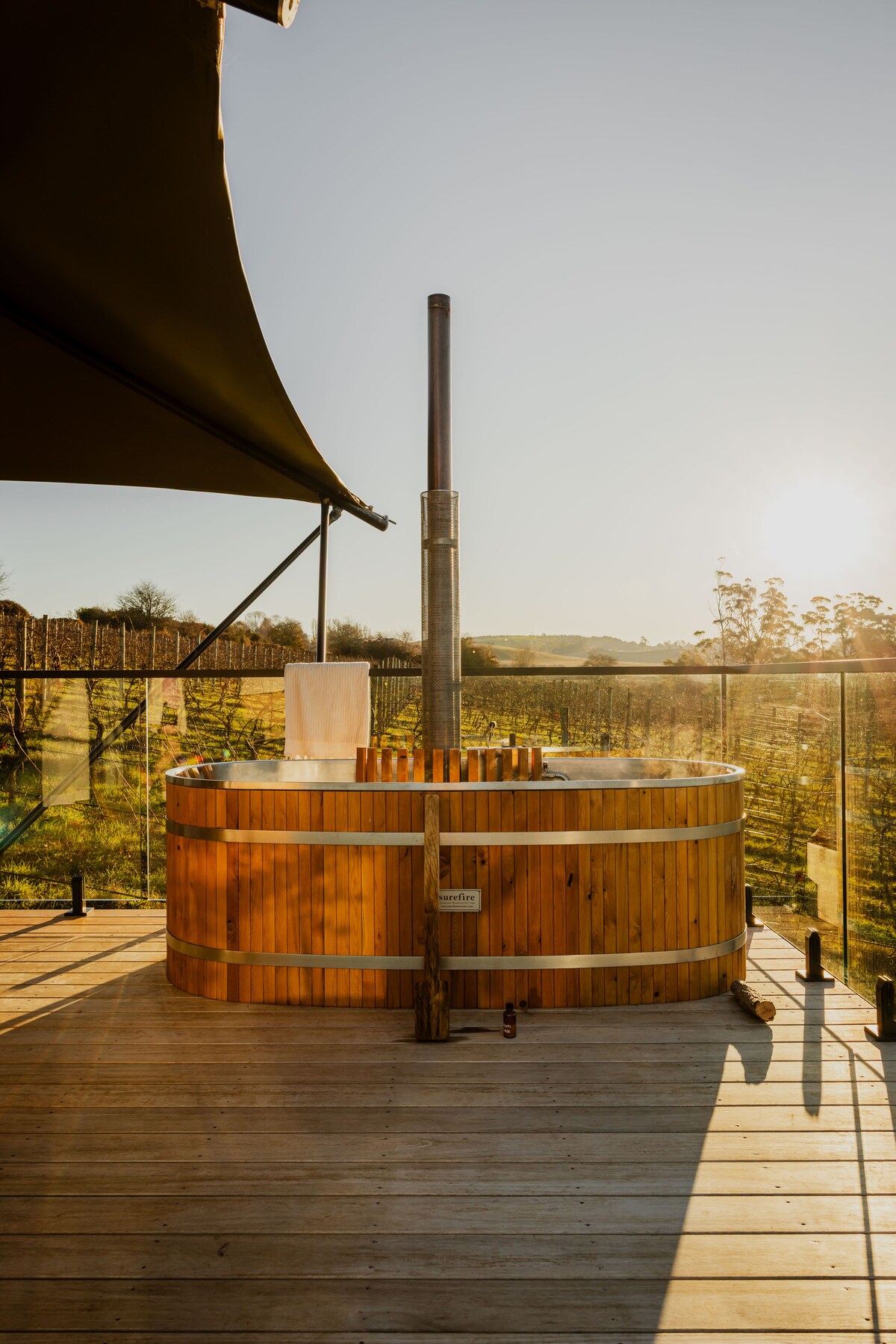 Escape to 'Barrel' one of two luxe glamping tents set on a 15-acre vineyard in northern Tasmania. Featuring a king bed, ensuite with heated floors, wood-fired hot tub, and Weber BBQ on a spacious deck. Guests are invited to visit the Meander Valley Vineyard cellar door, just a short stroll away. Enjoy a wine tasting and wood-fired pizza, all served with views of the vines. Book both tents for a shared getaway with space to unwind. A soulful stay among the vines, perfect for couples or friends.