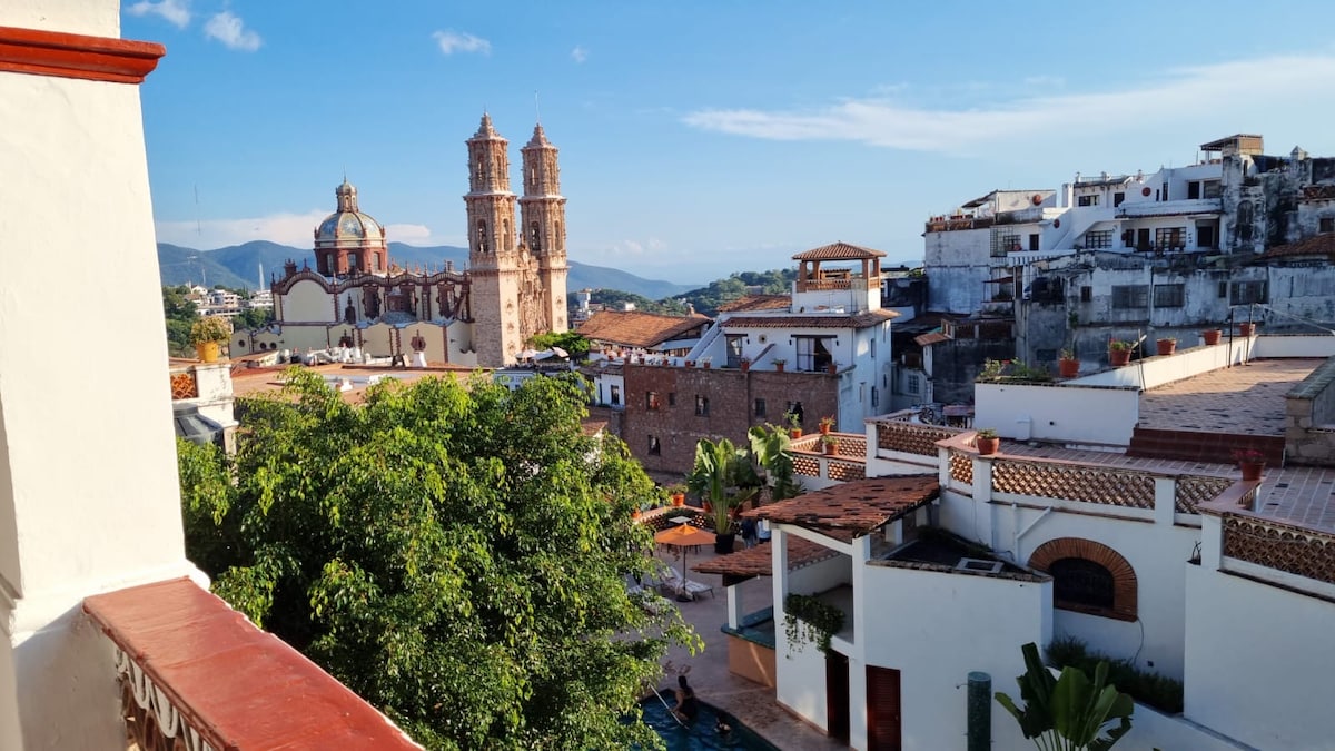 這間位於市中心的寬敞房源,經過精美翻修,讓您享受塔斯科(Taxco)。 2間臥室、獨立電視/閱讀室、餐廳、大露臺以及陽臺,以及迷人的景觀。 主臥室有1張加大雙人床,次臥室有2張雙人床。 每間一間一間一間一間獨立衛浴。 還有半浴室,配有洗衣機/烘乾機、藍牙喇叭和設備齊全的廚房。 距離Zocalo步行即可到達。 請注意,禁止攜帶寵物和吸煙。
