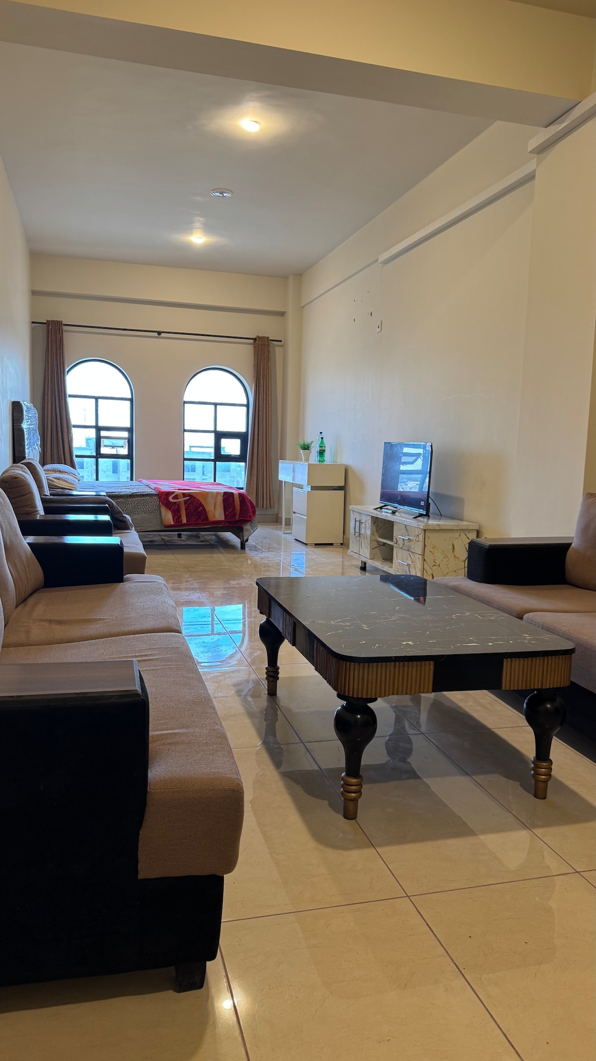 Enjoy a comfortable stay in this bright and spacious modern studio apartment, perfect for couples or solo travelers. Featuring beautiful arched windows that fill the space with natural light, this unit offers stunning open city views and a calm, relaxing atmosphere. The apartment includes: • A comfortable queen-size bed with fresh linens • Cozy seating area with sofas and a coffee table • Flat-screen TV • Dedicated storage space and dresser • Large windows with curtains for privacy