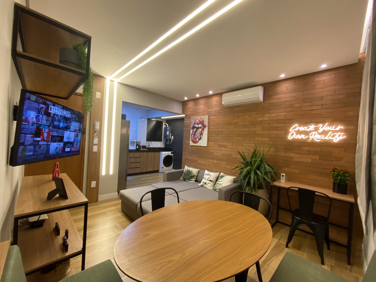 市中心單間公寓,位置優越,新近翻修。 毗鄰著名的Superpão麵包店、Espaço Multiuso Arp和Nova Friburgo鄉村俱樂部。地理位置優越,附近有餐廳、健身房、休閒、藝術、美食展覽會、啤酒廠、咖啡館等,步行即可抵達。 單間公寓配有加大雙人床、雙面沙發、配有雙層冰箱的廚房、電磁爐、咖啡機、50 吋全 HD 智慧電視、Wi-Fi 網路 大樓配有電梯