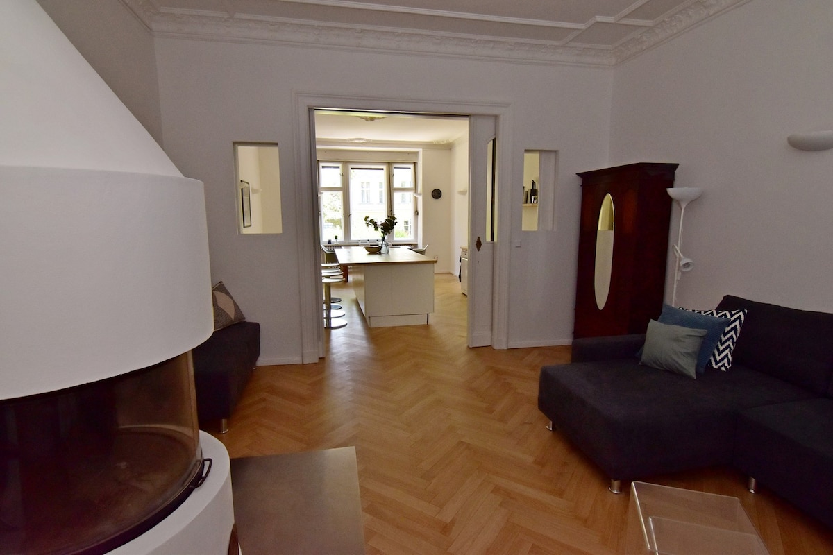 Stuckaltbauwohnung in 125 Jahre alter Großstadtvilla mit Kamin & eigener kleiner Sauna & Terasse in schöner und gut angebundener Villengegend. Kostenlose Parkplätze vor der Türe.