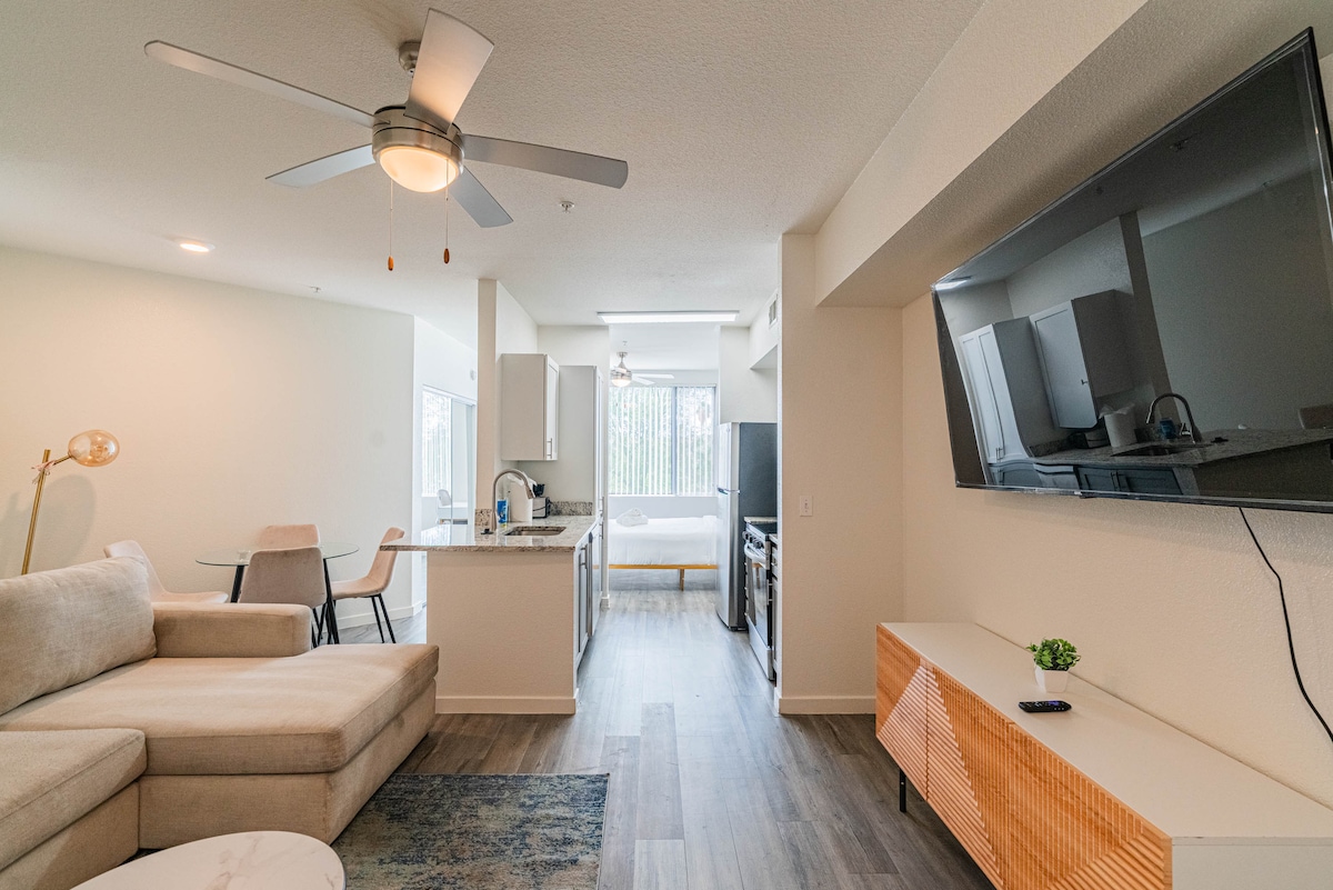 在Tempe市中心的舒適1居室公寓放鬆身心,舒緩的綠色調讓您感覺賓至如歸。 享受極佳的設備與服務,包括泳池、按摩浴池、健身房、撞球桌、咖啡吧和商務中心,讓您的生活更加便利。 距離亞利桑那州立大學、坦佩海灘公園和充滿活力的磨坊大道區僅幾分鐘路程,無論您是來放鬆身心還是探索,這都是完美的地方。 您一定會喜歡您的住宿體驗!