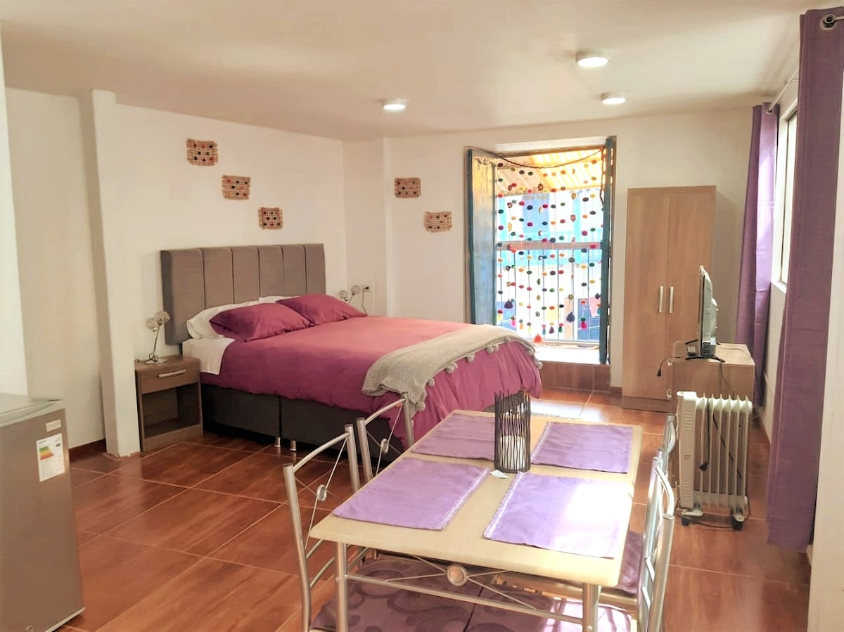 Mini apartment in Plaza San Blas artisan area of Cusco. Safe area. 3 blocks from Plaza de Armas in the City Centre within walking distance of everything central. 1 queen bed. Full kitchen. Central heating (rare find). Cable TV & net. Family owners live upstairs. Free and safe luggage storage while traveling.