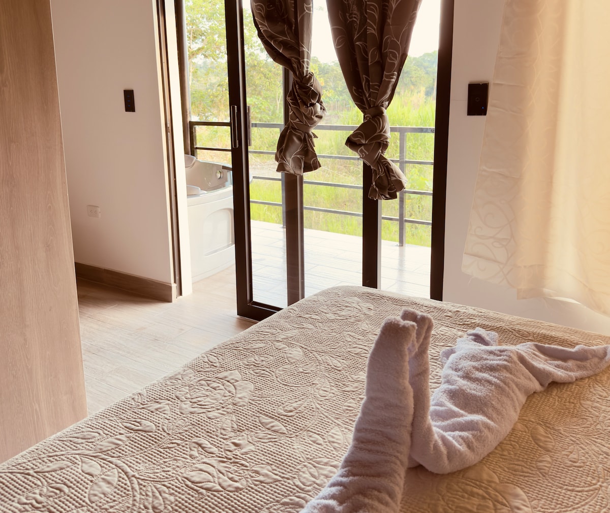 在 Tena 的獨立套房享受難忘的假期。 這間舒適的套房位於安靜的區域,四周是大自然,非常適合在亞馬遜一日冒險後放鬆身心。 它有空調,讓您舒適,還有私人按摩浴池,非常適合放鬆身心,享受叢林氛圍。 無論您是情侶旅行,還是尋找放鬆的空間,您都會找到舒適、安寧和獨特的感覺,讓您的住宿獨一無二。