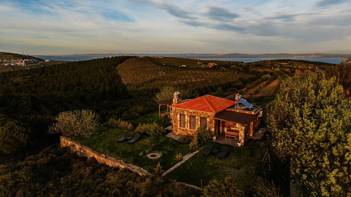 您位於Bozcaada最獨特的景點之一,可360度欣賞美景。 眼前就有風車和日落景觀。 您還可以在入口露臺上觀賞日出和滿月出口。 您可以在花園的秋千上享用早晨的咖啡,欣賞島上的美景。 如果您在冬天,您可以在壁爐前享用。 您可以獨自享受整個5英畝的花園和房源。 您可以放鬆身心!