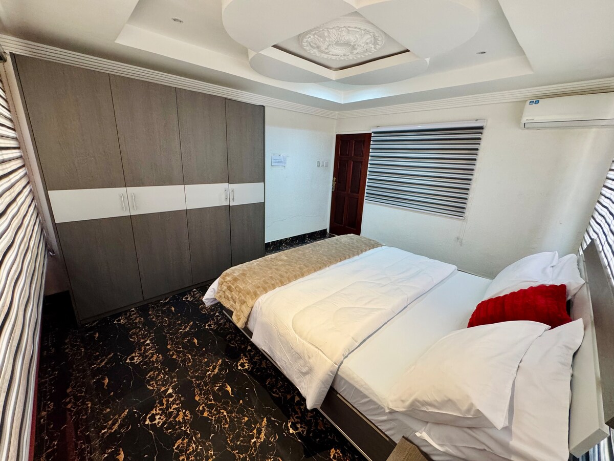 此公寓位於Mariville Homes Estate內,這是Spintex路附近的門禁住宅區,靠近Manet Junction。 房源距離機場僅15分鐘車程,提供安全寧靜的環境。 該莊園由私人保安全天候監控,確保出入受控。 公寓有兩間臥室,最多可舒適容納4位房客。 兩間臥室均為套房,配有標準雙人牀。