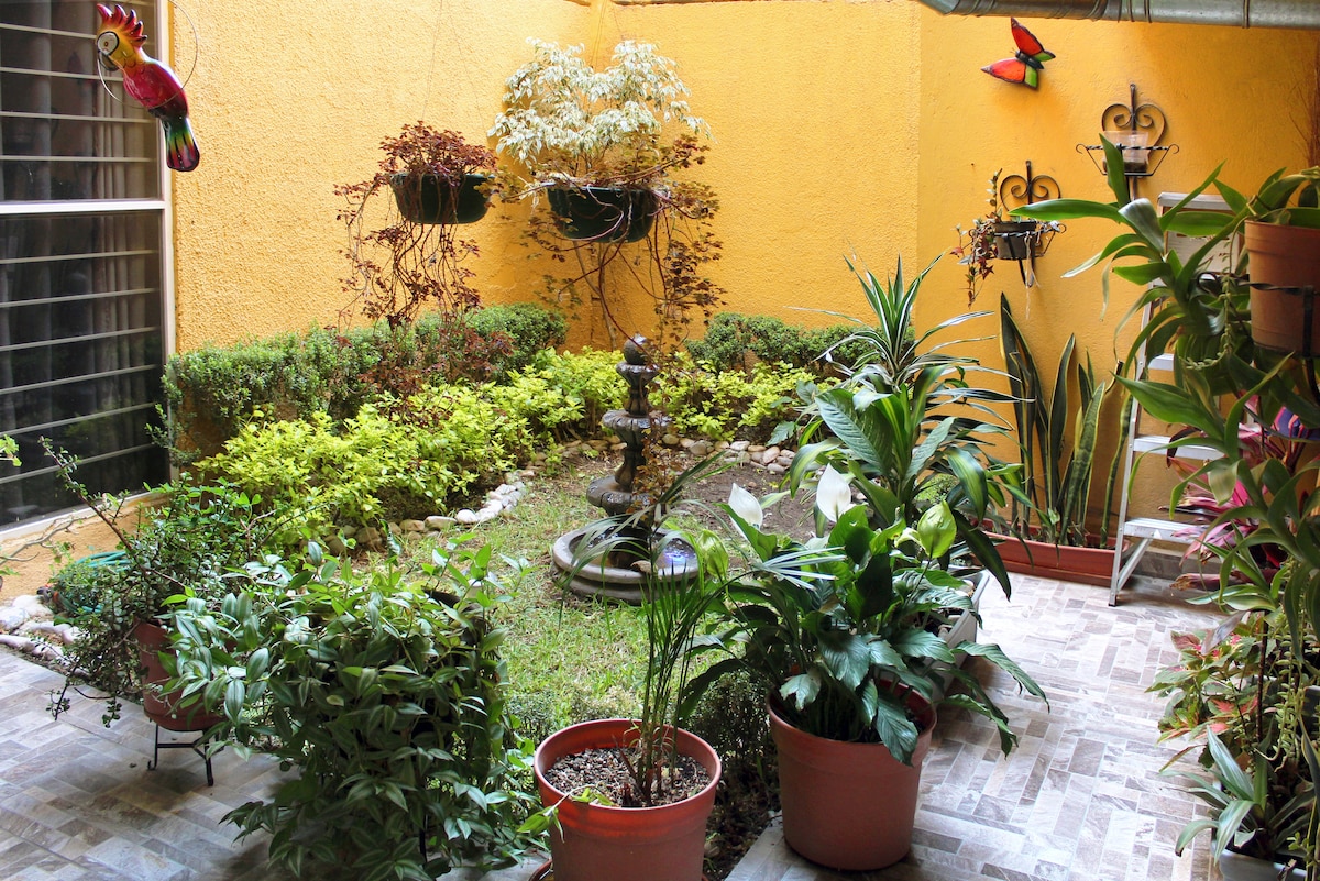 這是一樓的公寓,三間臥室:一間配有加大雙人牀和兩間雙人牀、兩間全功能浴室(一間配有浴缸)、所有設備與服務、廚房、餐廳、兩個露臺:均配有戶外家具。 房源非常安靜,開車5分鐘即可抵達Chapingo。 公共交通經過Chapingo前面,讓您在房子前面,反之亦然。 我們喜歡認識來自不同文化背景的人,很高興見到你。