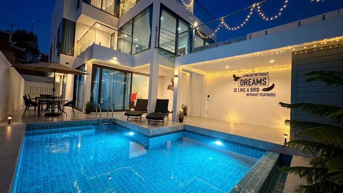 這間寬敞現代的房源位於芭塔雅最好的位置之一,位於安靜的社區,靠近公共交通線、餐廳、酒吧和咖啡店。 距離步行街和海灘僅5分鐘路程,可騎摩托車。 別墅有一間配有電視和沙發的大客廳、3間配有3張大床的臥室(第3間臥室是配有空調的夾層房間)、一個陽光露臺和一個最多可容納6人的私人泳池。 適合家庭和好友團體入住。