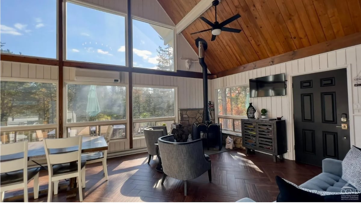 #2024-STR-AO-85 As seen in Chronogram magazine Chronogram/docs/chronogram-april-2023 High ceilings, Rough cut beams, All new HVAC and Hearthstone soapstone wood burning stove. Ping pong table. With Back deck tranquil getaway, you see and hear only the water flow with wrap around 4 season river right off deck. Close to scenic hiking, skiing, river tubing, and great restaurants along "Rapid Water"- The Algonquin Nation word for "Shandaken". Dogs welcome (Up to 2), sorry no cat