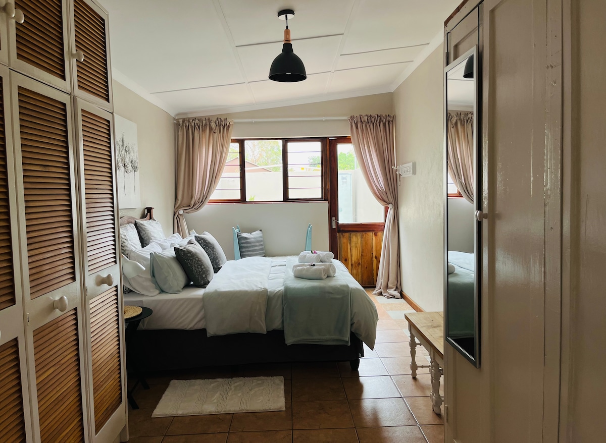 這間寧靜的私人花園小屋採用單間公寓布局,坐落在大樹之間,鳥鳴聲和噴泉聲伴隨著您。我們有太陽能和備用水。位於城堡門、Menlyn購物中心和布魯克林購物中心之間。距離Mediclinic Kloof醫院和Groenkloof Life醫院不到5公里。2公里內有精緻的餐廳和外賣。小屋設有壁爐,可供寒冷夜晚使用,還有火坑可供娛樂。