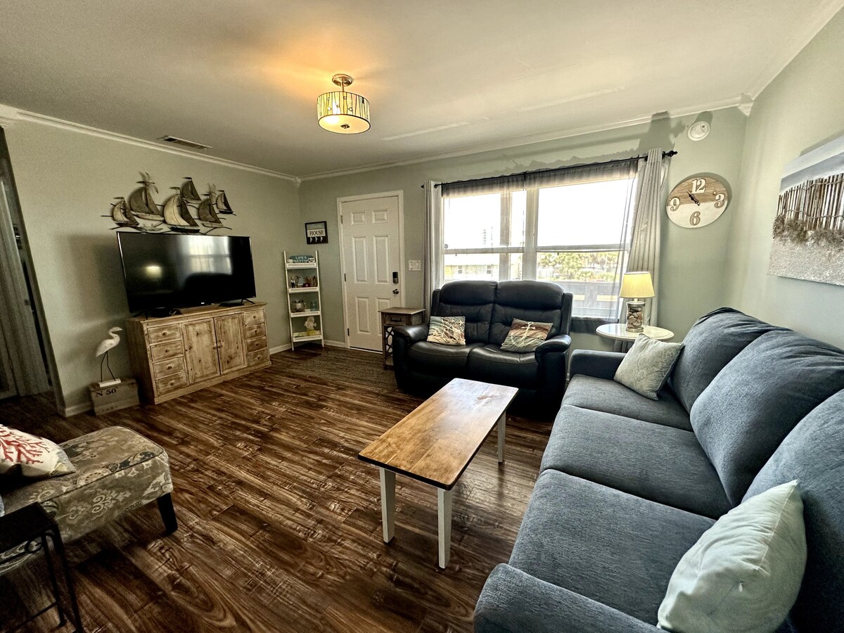 2 bedroom, 2 bath unit is on the 2nd floor of a low density complex (only 59 units). The beach view is grand from our balcony… right in front of you as you walk out the door! The living room has a large window showing a stunning view of the sugar sand beach and sparkling blue waves below. From the balcony you will enjoy drinking coffee and watching the activities on the beach, the red sunset or taking a nap listening to the methodical rolling of waves against the shore...