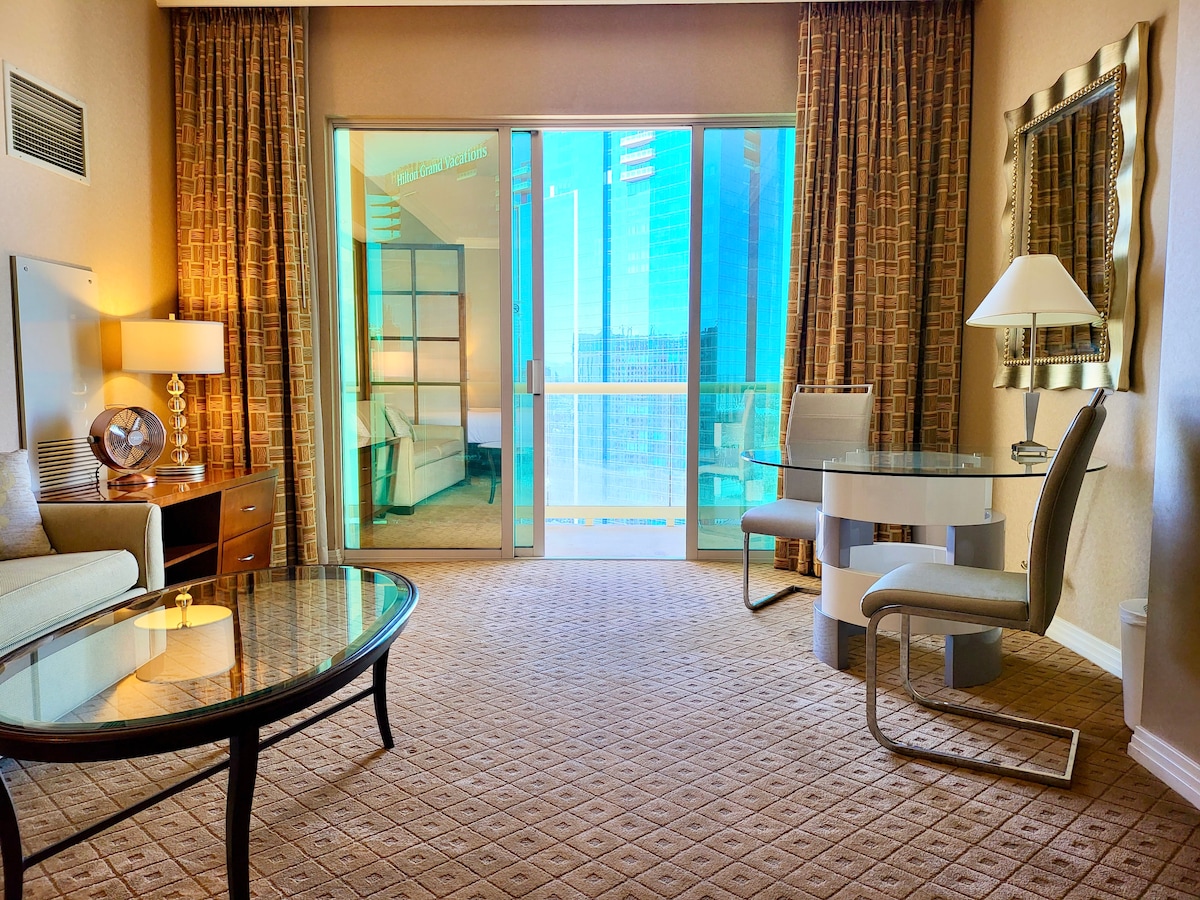 如果您正在參觀拉斯維加斯,並希望入住Vdara或靠近賭城大道,無需再尋找! 我們的套房位於Vdara Hotel & Spa的50樓,這是一家非賭場、禁煙、全套房飯店,位於MGM的城市中心。 你將享受飯店式的入住/退房服務和設備與服務(WiFi、泳池、健身房),且無須支付額外的度假村費用或稅費。 預訂的主要人員必須年滿 21 歲,並需要有效的身分證件和信用卡/簽帳卡才能入住。