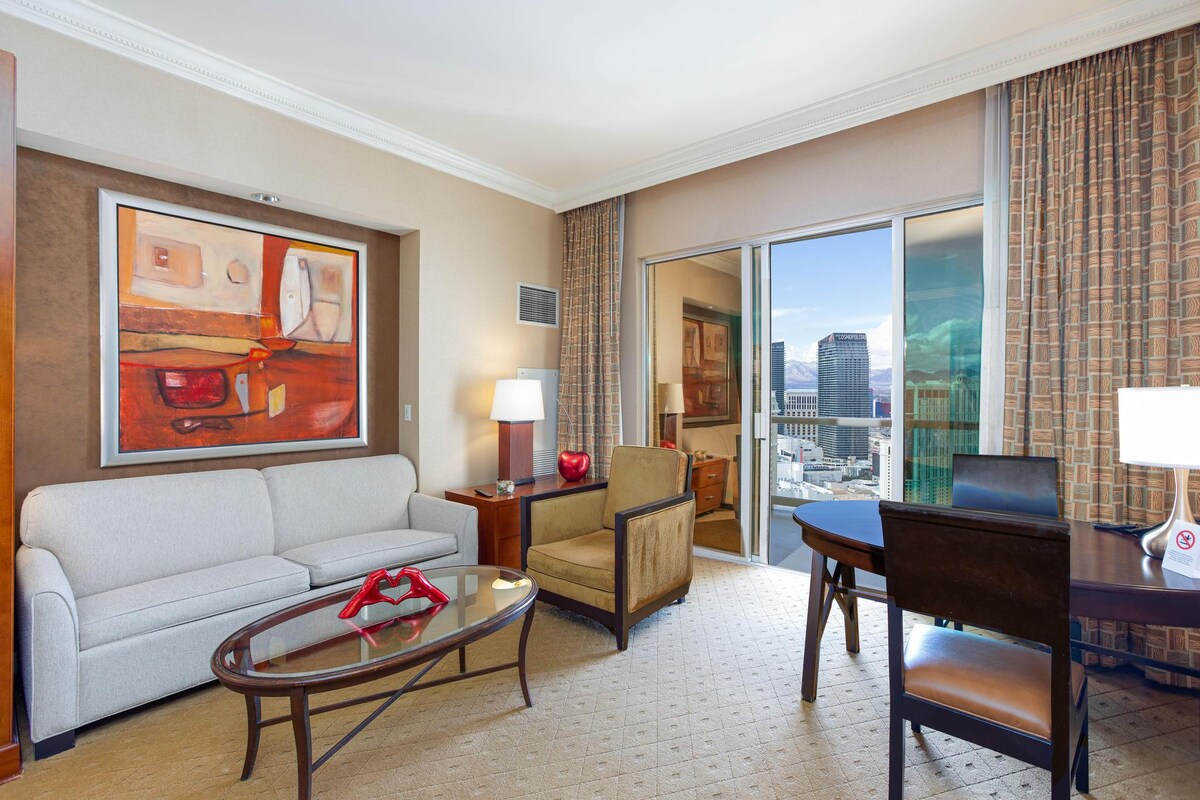 無度假村費用。無清潔費。 Palms Place Hotel and Spa感覺更像是家,而不是飯店。 遠離賭場的不間斷活動。 位於Palms Place的四鑽豪華單間公寓是當代奢華的案例研究。615平方英尺的生活空間,配有客廳、高檯餐桌、小廚房。 所有房客均可使用附設的全尺寸陽臺露臺,可欣賞街道、城市和山景。 棕櫚卡持卡人每晚 100 美元,退房時移除