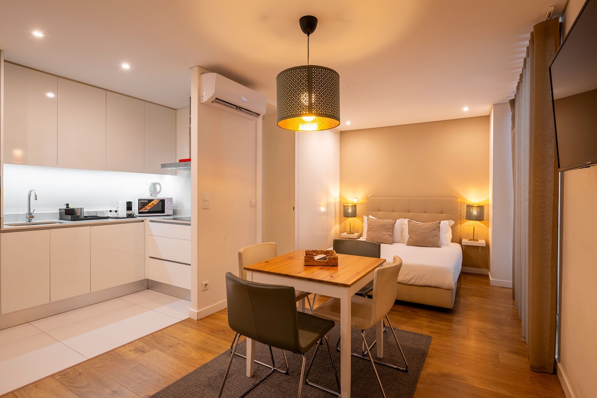 This beautifully furnished studio apartment is located in the heart of the city's historical center — Sé de Braga. The apartment is newly renovated and features design interior with modern high-quality kitchen and bathroom appliances, wide-screen TV, free Wi-Fi, A/C and a large balcony. Very bright, spacious and cozy. The building is located in the family-friendly & quiet neighborhood and is steps away from the most lively area with many famous tourist spots.