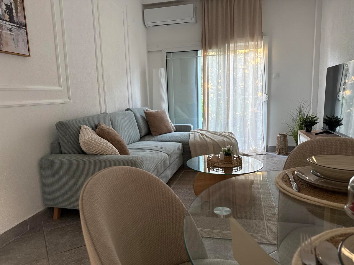 Welcome to your modern, fully renovated city retreat in Mpotsari, one of Thessaloniki’s most peaceful and pleasant neighborhoods. Just a 5-minute walk to the famous Promenade, located between two metro stations, and only 15 minutes from the airport, this bright 44 m² apartment offers the perfect balance of comfort and location. Whether you're visiting for a romantic getaway, a city break, a family trip, or a longer stay, this home is designed to make you feel at home from the very first minute.