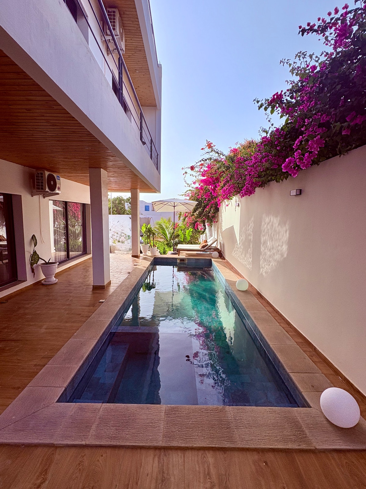 Le Charme de Somone – Villa située dans un quartier calme et résidentiel, idéale pour un séjour en famille ou entre amis. La maison a été pensée pour offrir confort et simplicité, avec des espaces agréables à vivre. 4 chambres climatisées (dont 1 au RDC), 4 salles de bain, piscine privée, salon lumineux, cuisine équipée et terrasse extérieure. Proche lagune, plage et commodités. Wifi, TV connectée. Équipe disponible sur place si besoin.