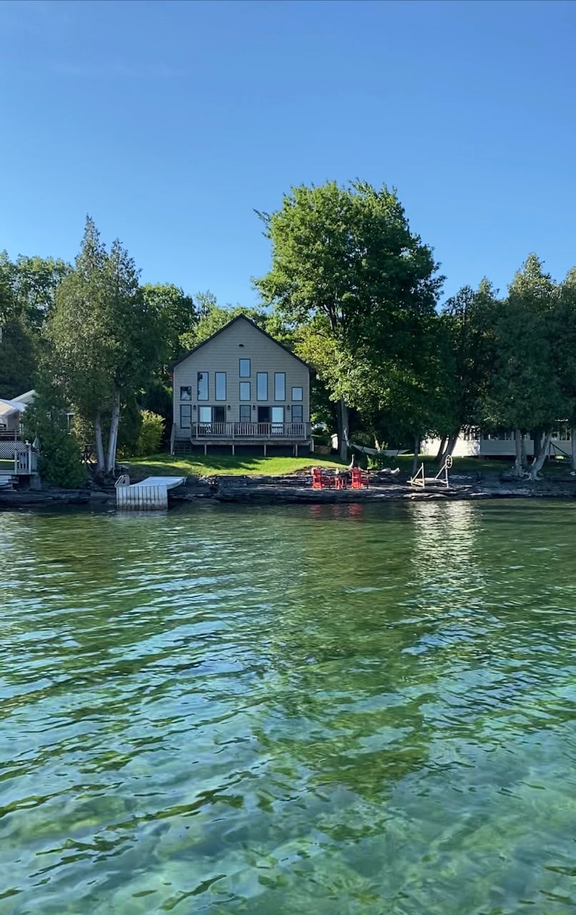 Gorgeous modern luxury riverfront cabin. Swim, boat, fish, watch the ships pass. Enjoy the remarkable sunsets. Large comfortable deck, dock, plenty of outdoor space to immerse yourself in the serenity of the St. Lawrence. Enjoy your time sipping wine or coffee on the rocks at the waters edge. 3 bedroom 2.5 bath. Full kitchen including double oven, gas stove, wine fridge. 52” tv with all apps as noted in the amenities section. However, you must use your own login for any of the apps.