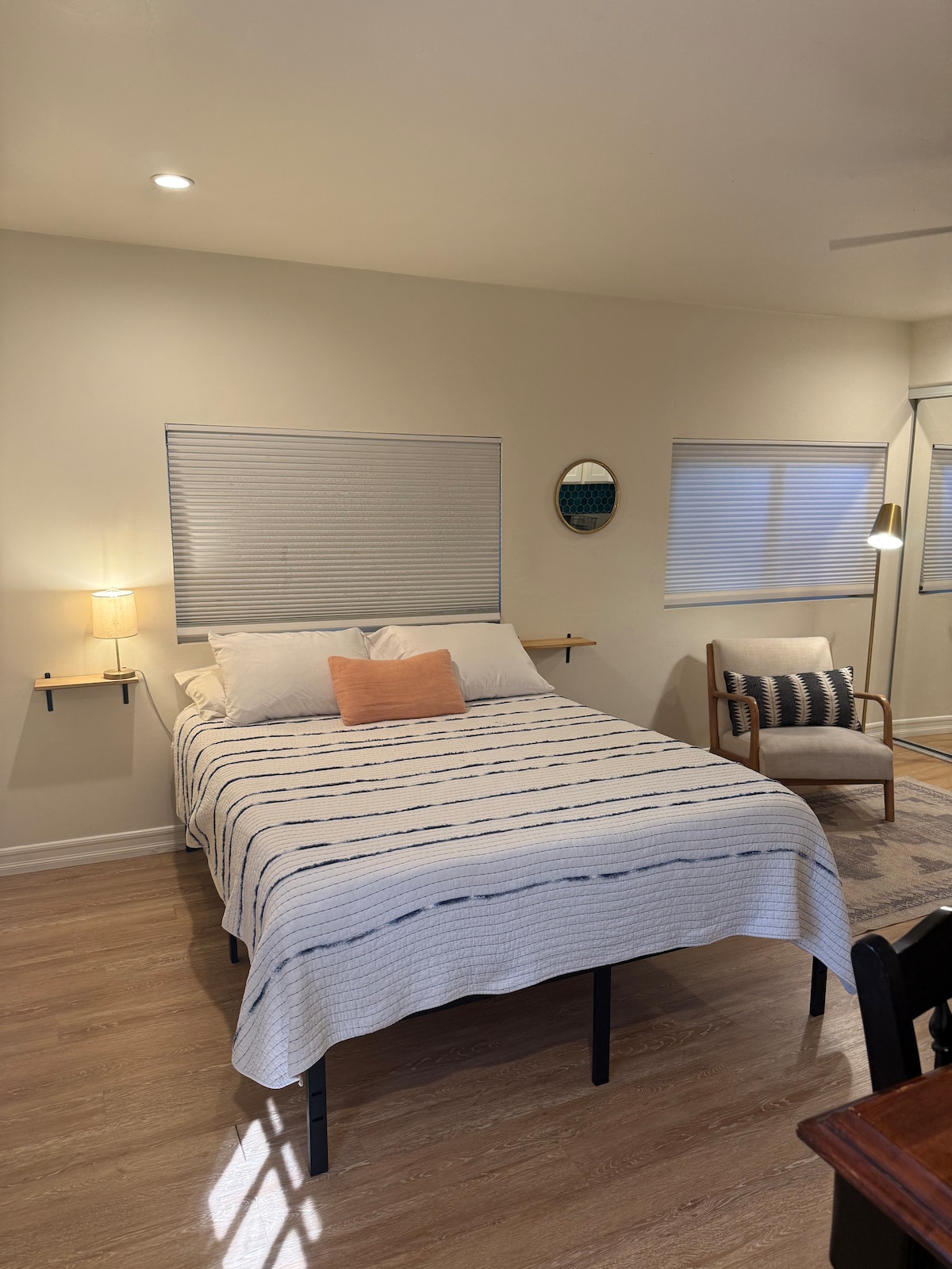 這是一個非常舒適的無菸客用住房/單間公寓,配有獨立入口。 由於我對動物過敏,絕對不允許攜帶動物入住。有一張雙人床。獨立全套浴室。 有梳妝臺空間和衣架。這裡還有一張辦公桌。智慧電視可與串流服務一起使用。此房源沒有廚房。但它有一個小冰箱和一個微波爐。 建築物內任何地方都嚴禁拍攝或攝影。未經我的同意,不允許訪客入住。