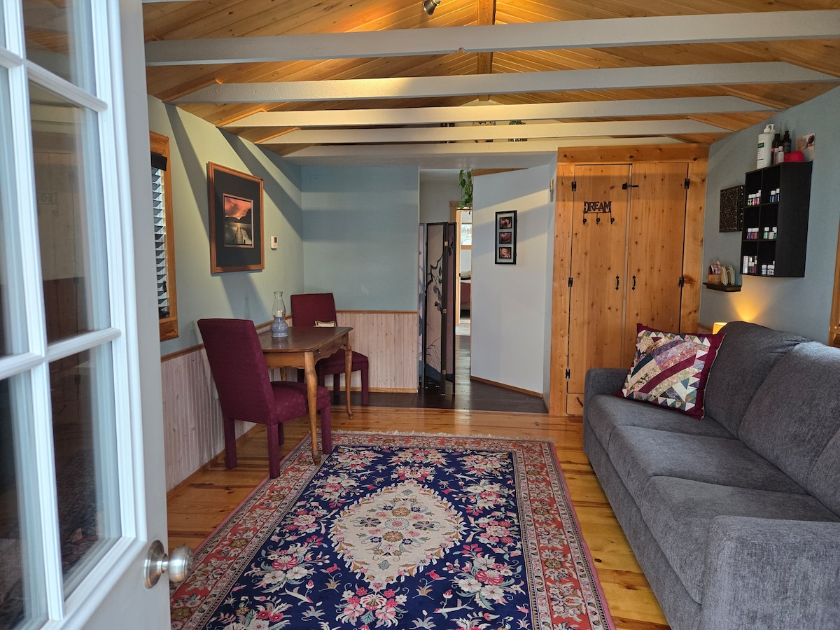 這間280平方英尺的迷你屋擁有舒適的臥室和美麗的高天花板。 直梯通往鋪有地毯的小閣樓,地板上有一張雙人床墊。 主臥室的標準雙人牀配有柔軟的牀墊。 大多數人認為它既奢華又舒適。 需要堅固牀墊的人可能不想選擇這間鄉村小屋。 只需幾分鐘即可抵達州際公路。 小廚房有水槽、微波爐、單爐、小冰箱、碗盤和餐具。