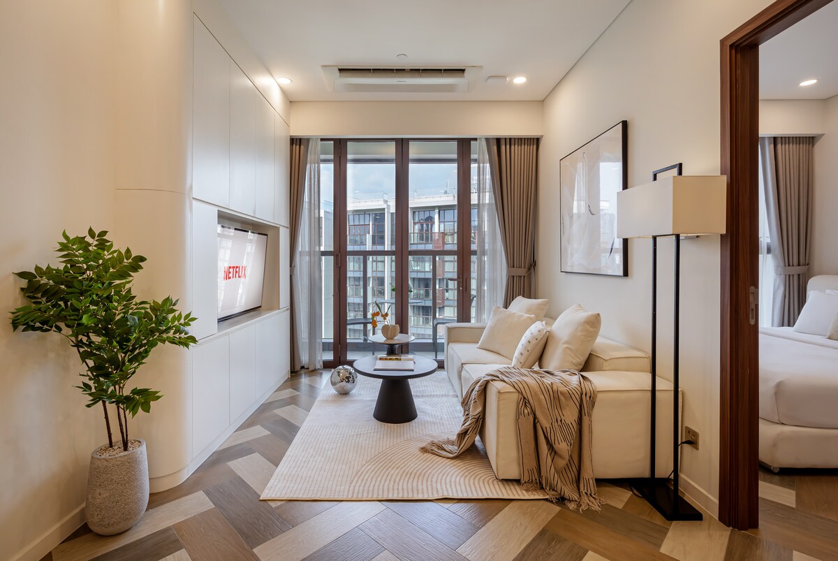 This unique place is designed for a luxury-in-style experience. With a smart sliding door, your living room and bed room are easy connected to maximize spacious 50m2 house. Walking on the BaSon bridge between the condo and D1, you can feel the breeze of Saigon river and spectacular view of the city. By just 5 to 10 min on cab, you can get to city center.