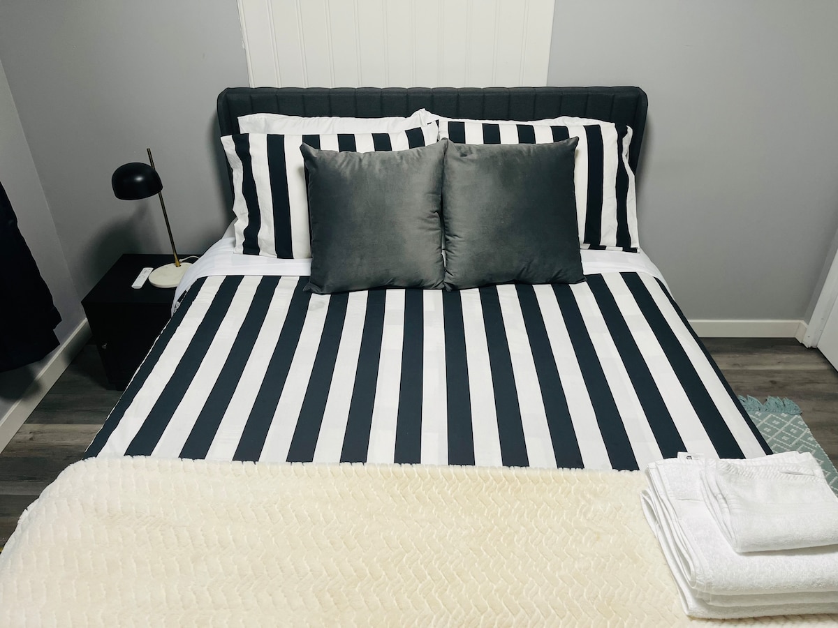 私人地下室套房,配有標準雙人床,額外的兒童/額外客房,配有單人床 獨立廚房 獨立洗手間 每日免費早餐 密碼鎖可供入住 指定免費停車位 寬敞的房間,有書桌 HD電視、免費高速光纖Wi-Fi、Netflix和AmazonPrime 免費洗衣、RO水和24小時全天候室外攝影機監控 巴士站在門口 距離雷灣高速公路 3 分鐘 2分鐘即可抵達聯邦學院 5分鐘即可到達醫院 3分鐘即可抵達霍加斯(Hogarth) 2分鐘即可抵達No frills、shoppers、Tims