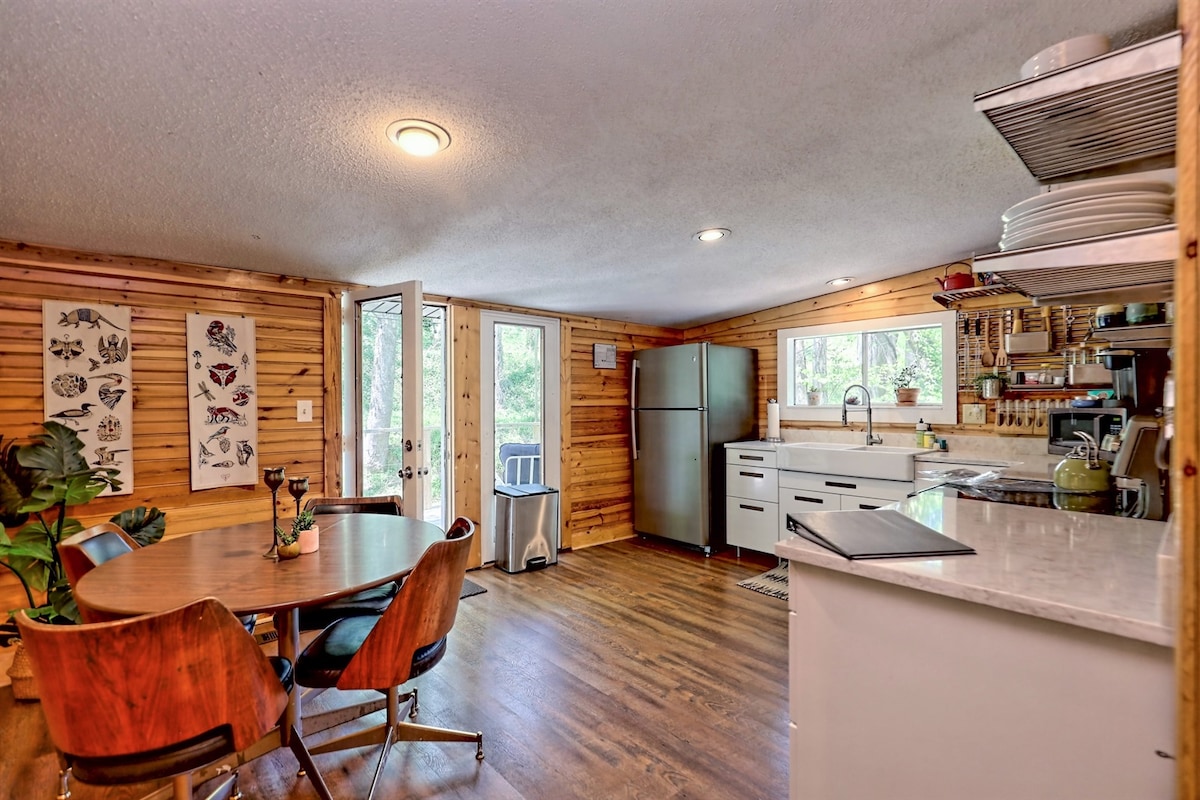 這間 820 平方英尺的小木屋位於溪邊,完美融合了 1950 年代的魅力和現代舒適,有兩間雙人臥室、明亮的廚房和輕鬆的客廳。 步入後門廊或溪邊露臺,慢慢享受早晨和日落時的聊天,然後漫步5分鐘到克萊頓市中心享用晚餐、精釀飲料和甜點。 之後,在星空下泡個按摩浴池。 步行幾分鐘即可抵達步道、瀑布、白水和黑岩山景。