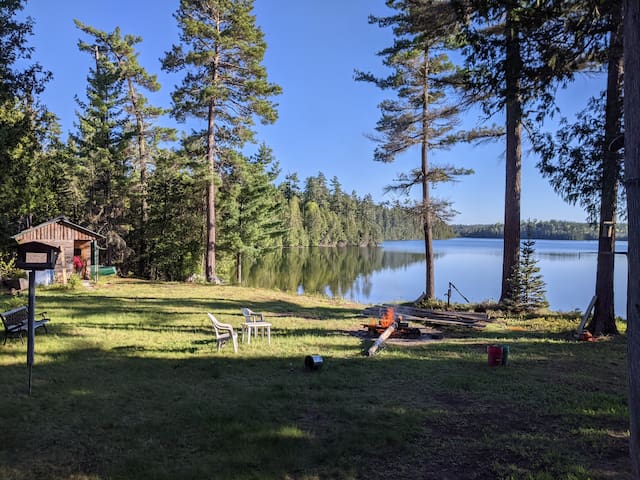 A western red cedar wood and glass cabin on a wonderful spot: a rocky peninsula, pines, loon calls... Enjoy sunsets from deck or dock, dive into the lake, enjoy water reflections while reading inside or when outside. UNLIMITED HIGH SPEED INTERNET Wi-Fi. The Cabin, a 13 corners structure on two levels is facing the lake on three sides. The only cabin by the water on the lake to explore by canoe. Great fishing (Lake Trout and Pikes), road access, free parking.