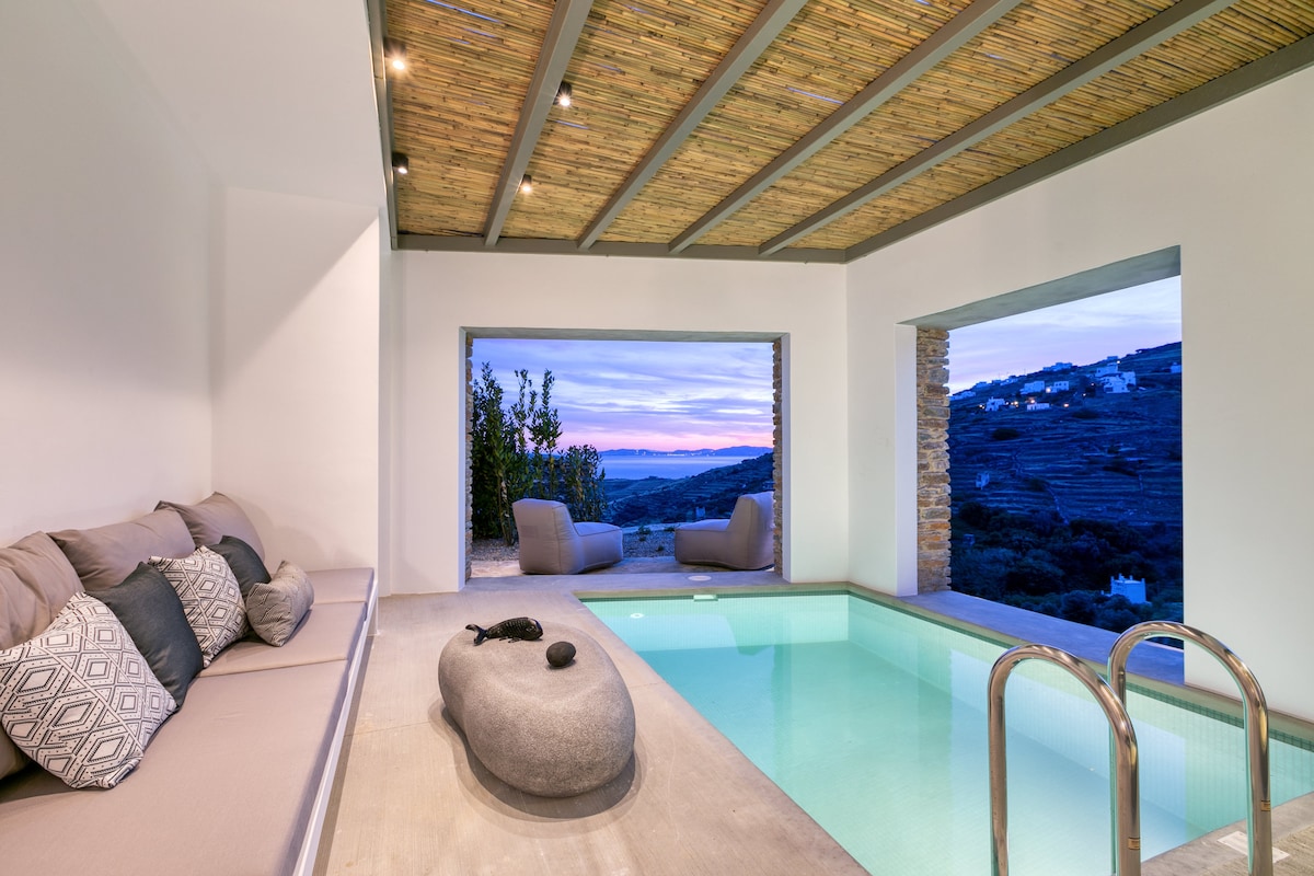 山巔上有一棟白色的房子, 具有島嶼氛圍和現代感。 Wi-Fi 串流沒有延遲, 冷空調能驅散熱氣。 爬上六十階樓梯,雙腿可能會感到灼熱, 但180次瀏覽量是你的回報。 如果你渴了,別走太遠 下面有救援:酒吧! 體驗正宗希臘風情