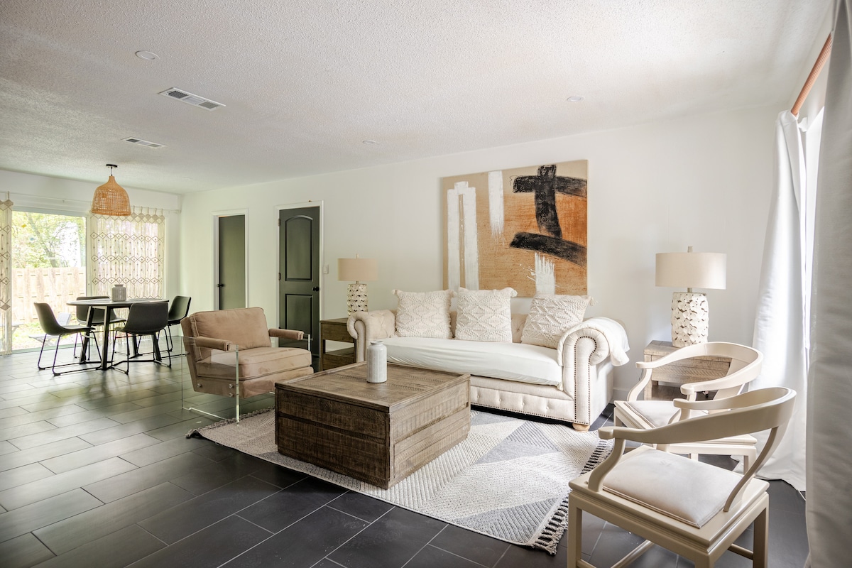 NEWLY RENOVATED - Enjoy your Gainesville stay in this mid-century modern studio 0.5 miles from UF and 2 miles from UF and HCA hospitals. No detail was overlooked in this beautifully designed detached guest house with an abundance of natural light, upscale finishes, and endless amenities - kitchenette, mini fridge/freezer, smart TV, and more! This conveniently located private and quiet space in the heart of Gainesville is perfect for anyone visiting for just one night or a few weeks.