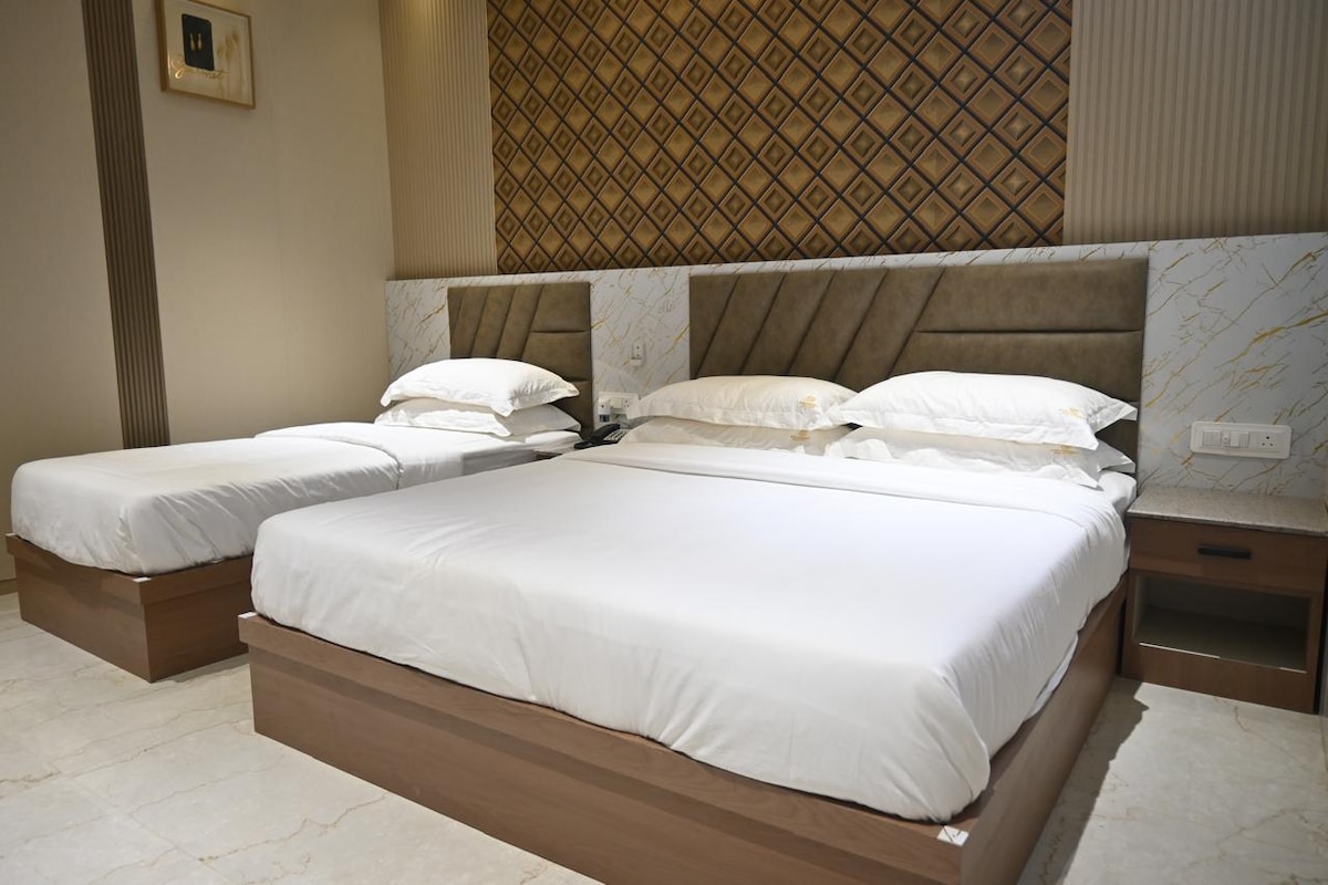 高級房間非常寬敞,建有225平方英尺,有一間附設浴室的臥室,臥室有兩張標準雙人牀,此外,還有兩張牀可以舒適地放鬆。 所有房間都有分體式空調,所有房間都固定著一個巨大的窗戶,在那裡您可以欣賞Tiruvannamalai的山景。 43英寸帶有線頻道的智慧LED電視也允許OTT與房客訂閱。 配備逆變器的免費WIFI ,在停電期間有幫助。