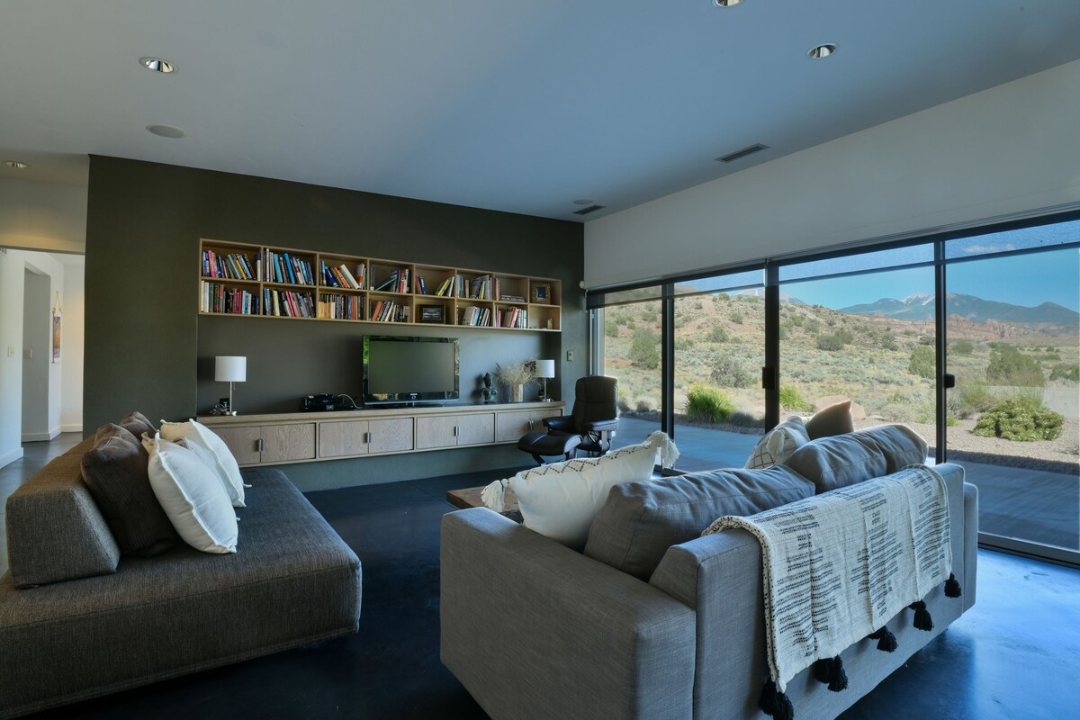 Unwind in contemporary style on the edge of public land with unobstructed La Sal Mountain views. Walk private trails to the lake and nearby petroglyphs, then soak in the hot tub or gather around the fire pit. Every bedroom opens to the patio, blending indoor comfort with desert air in this design-forward retreat.