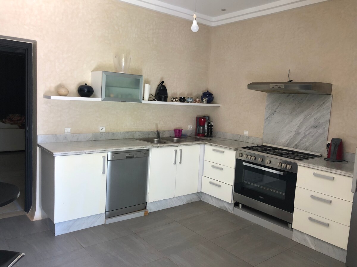 這棟豪華別墅坐落在 3,000 平方公尺的景觀花園中,花園內種植了擁有數百年歷史的橄欖樹和棕櫚樹。 4 間優雅的套房,每間均配備獨立浴室、更衣室、電視、空調和壁爐。 寬敞明亮的起居室可通往泳池和花園,設備齊全的廚房、健身房和露臺可欣賞 Atlas 泳池的迷人景色,還有燒烤區和室外用餐區,讓您度過難忘的時光。 閃亮的乾淨度 免費牀單。