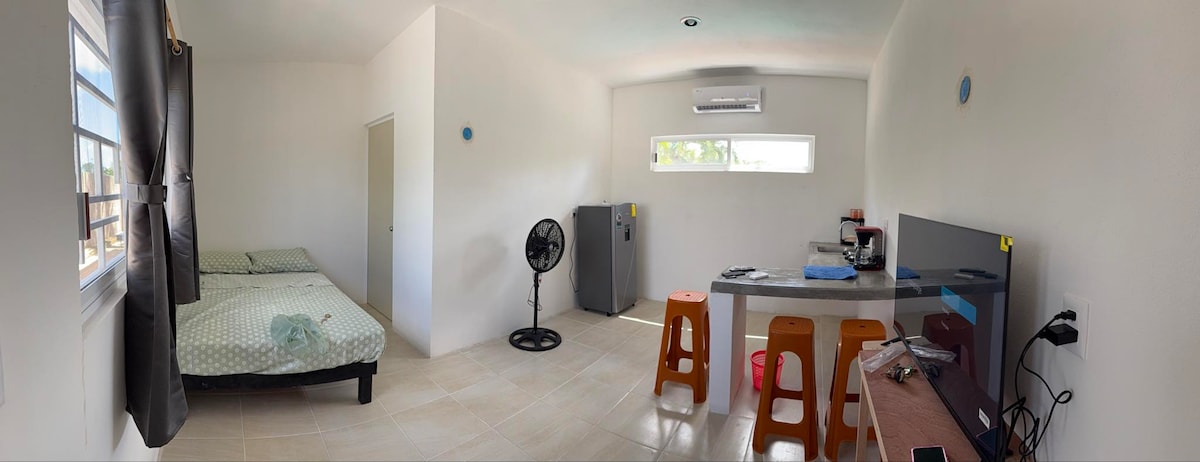 單間公寓,可容納 2 至 3 人。Los Aguacates,距離動物園 2 分鐘,距離市中心 7 分鐘,距離 Feria de Reyes 會場 6 分鐘。非常靠近梅里達出口。 配備: - 雙人床和吊床架(不包括吊床) - 早餐吧 - 配有迷你吧、咖啡機、烤架和餐具的廚房 - 有線電視和 Amazon Prime Video - 浴室和熱水 - 空調 - Wi-Fi