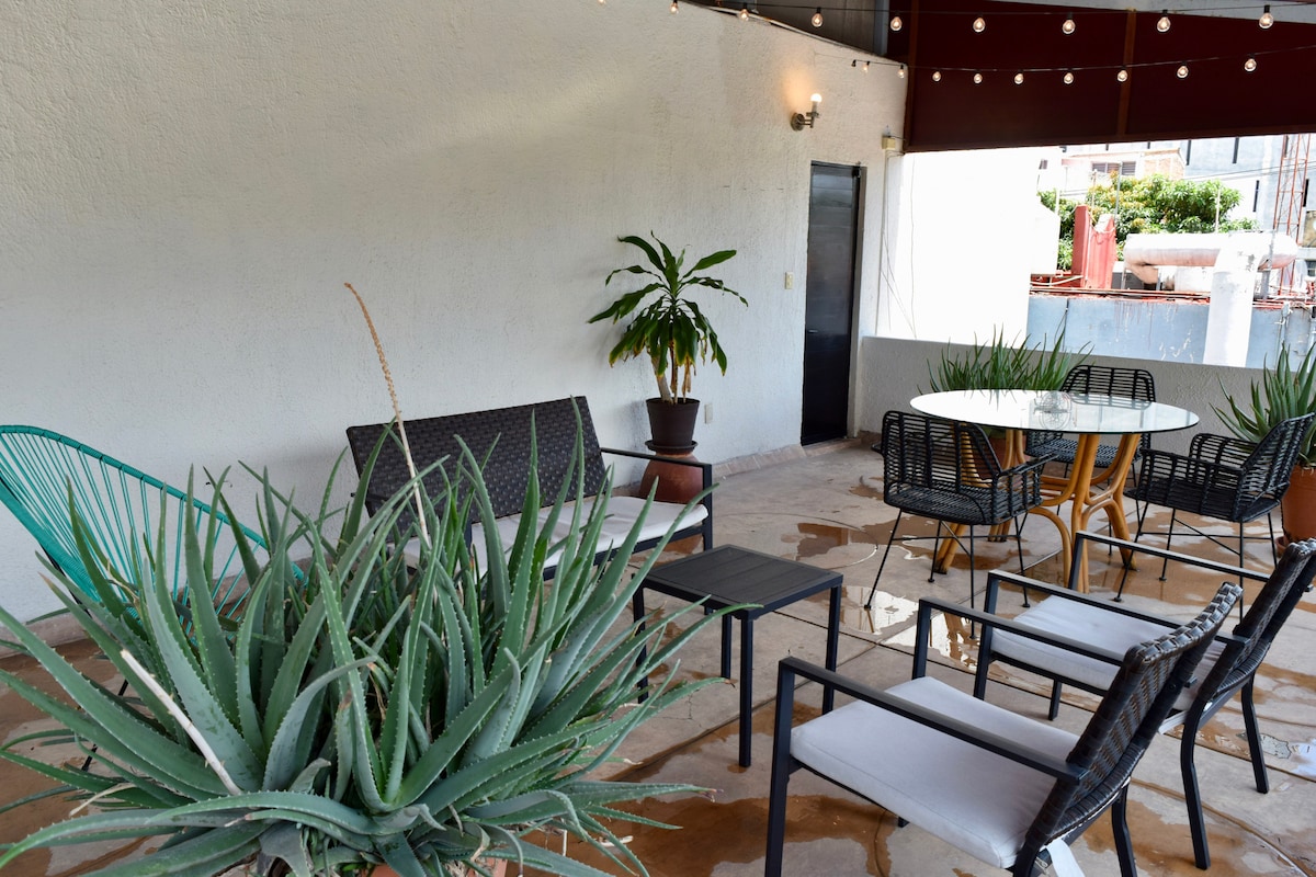 El estudio cuenta con lo necesario para pasar una estancia comoda y agradable, su terraza le da un ambiente de relajación, cuenta con un ventanal que permite ventilación y mucha iluminación, además tiene su propia cocina y su baño privado. Aquí podrás descansar gracias a la confortable cama que hemos preparado para ti, asi como una smart tv para que puedas disfrutar de tus series y programas favoritos. Nuestra recomendación es que disfrutes de la terraza con alguna rica bebida y compañía.