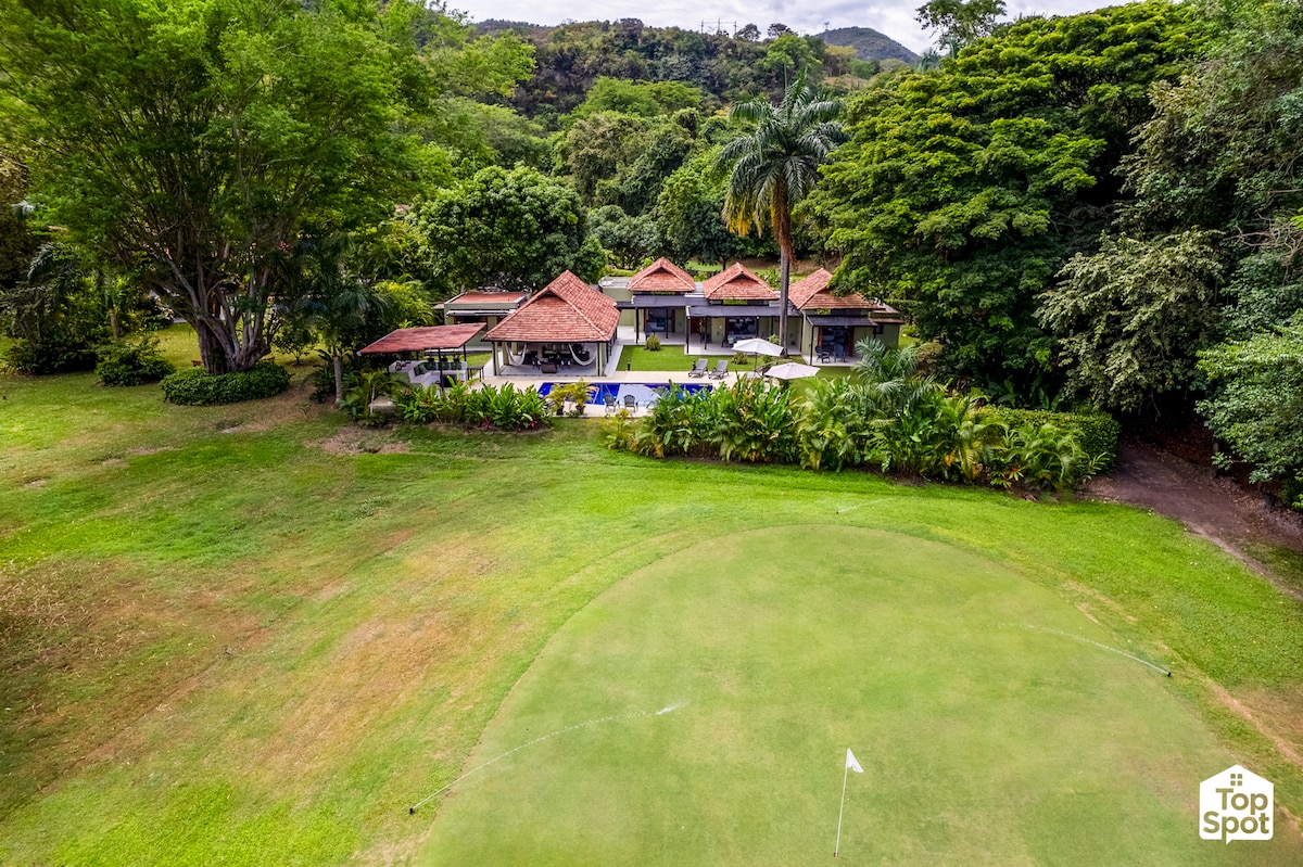 非常適合與大自然相連的休息。位於獨家私人俱樂部,提供24小時保安、高爾夫球、網球、步道賽道和自行車。 景觀壯麗,天氣非常好。配有日光浴牀的私人泳池。設備齊全的房屋: 2個配有瓜杜瓦天花板的社交區域; 3間配有獨立浴室和熱水的房間,包括牀單和毛巾;開放式廚房和燒烤、配有直播電視的電視區域、乒乓球、WIFI。180度露臺和私人花園,有果樹。我們對寵物很友善。