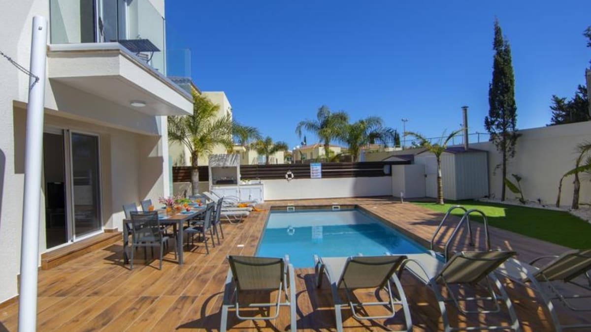 Modern and private 3-bedroom villa in central Pernera, in Protaras, just 2 minutes from Kalamies Beach and the town center. It features a private pool, free WiFi, satellite and smart TV with access to apps like Netflix (personal account required), and air conditioning. Sleeps 6 people, plus 2 more on a sofa bed and 1 child in a cot. Ideal for families or groups of friends.