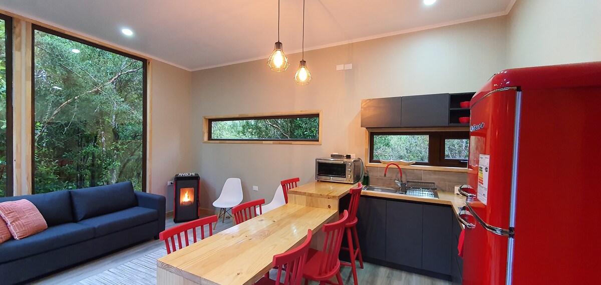 Es una cabaña rústica tipo Tiny house(cabaña pequeña) sustentable para 2 personas. MUY IMPORTANTE :No tiene tv, cuenta con un pequeño frigobar, secador de pelos, cuenta con cocina a leña y aire acondicionado frío calor. Cuenta con una tina caliente tiene costo extra de $40.000 pesos. Rodeada de árboles nativos fué construida tratando de mantener el equilibrio con el alrededor. Hay un fogón al aire libre. A 1 kilómetro y medio está el pueblo de Río Puelo y a 3 kilómetros de las Termas del Sol