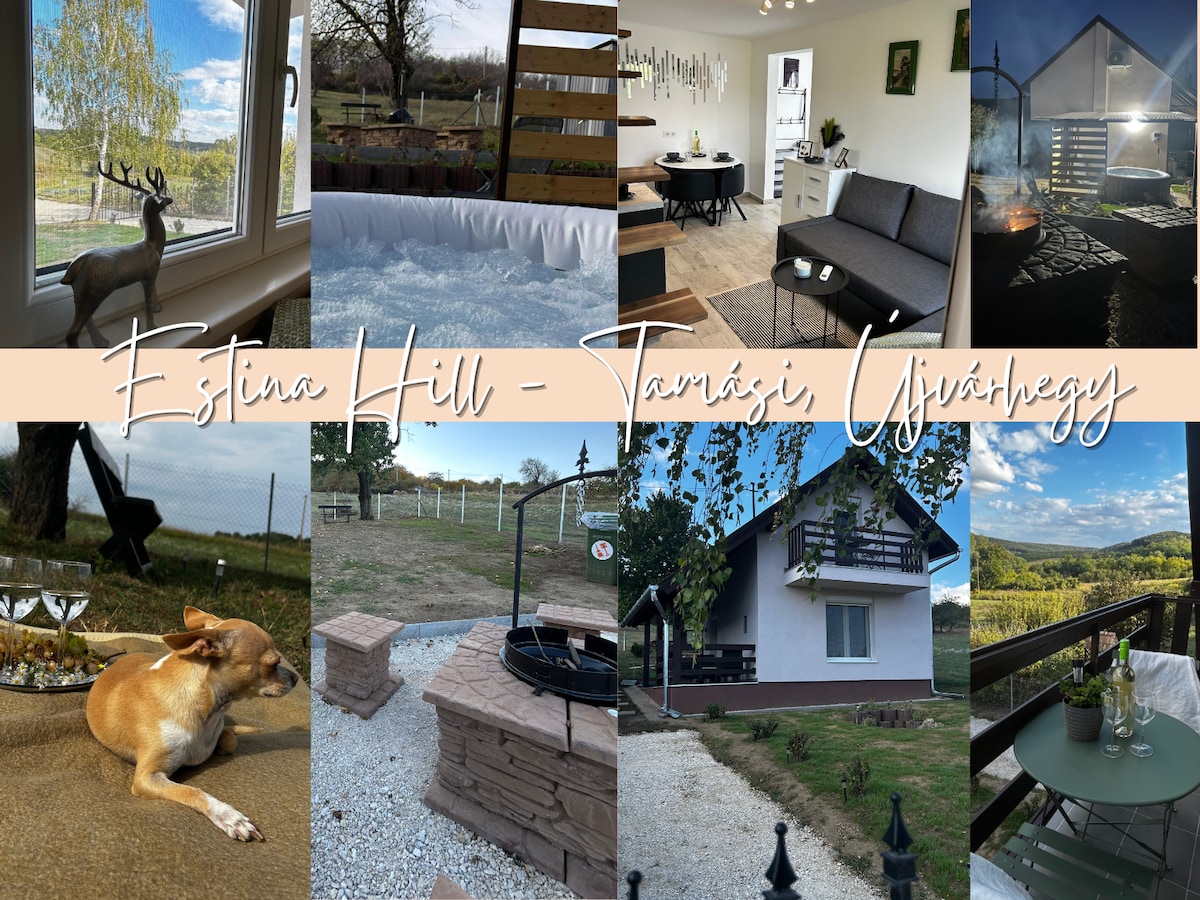Estina Hill | Boutique Hillside & Thermal Spa Enjoy a stylish hilltop retreat in Tamási! This modern, detached guesthouse for 2–4 guests offers panoramic views and peace. Features: cozy bedroom, AC on both levels, and a fully equipped kitchen. Relax in the private garden with a grill and fire pit, or unwind in our scenic jacuzzi on the covered terrace. Free parking included. Minutes away from Tamási Thermal Spa, hiking trails, and nature. The perfect year-round getaway!