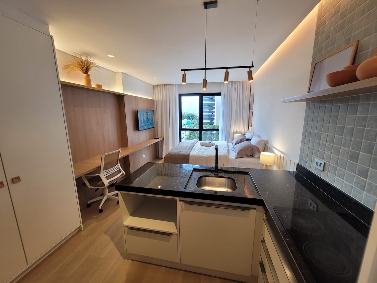 現代化的單間公寓,全新、舒適、地理位置完美,陽臺景觀美麗,尤其是在夜間。快速Wi-Fi、辦公桌、55英寸智慧電視、標準雙人床。空調(冷/暖)。 洗衣機和烘乾機,以及一個漂亮的廚房島。 50 平方公尺,非常時尚 - 27 樓,安靜。 位於市中心/Batel,靠近商店、銀行、購物中心、美食中心和醫院。 大樓內:游泳池、健身房、遊戲室、桑拿、按摩浴缸、24小時門衛。