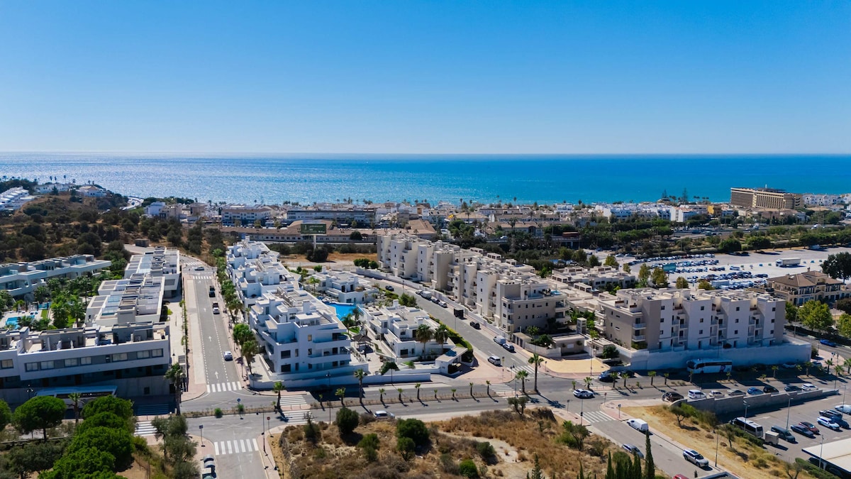 Indoor pool (heated) is open during the winter. Outdoor pool open all year. Modern apartment with sea- and pool view from the large terrace. Elegant with two bedrooms and two bathrooms, one en suite. All rooms have central air con. In the fully equipped kitchen you got kitchen island and dining area. Flat screen TV. Free WiFi. Only 2 km to the beach Parking in garage is included. The apartment is perfect for six guests. You have pool areas, sauna (fee) and a gym. Golf courses nearby.