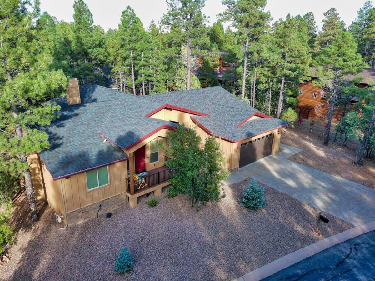 Chalet in the Woods 是一間位於亞利桑那州 Show Low 的山區度假屋,周圍有高大的松樹,歡迎攜帶寵物入住。 房源提供兩間主套房、兩間大房間和一間遊戲室,以及一間有高天花板和森林景觀的美食廚房。 享受私人樹林、甲板、中央空調和暖氣、快速Wi-Fi和特斯拉電動車充電器。 由 Interiors by SHA 精心設計,提供舒適和長期住宿。