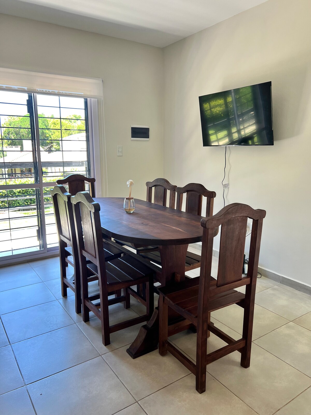 Moderno APART, excelente ubicación y acceso a servicios, confortable y seguro. Un espacio equipado, amplio y cómodo para una estadía confortable que les permita descansar, relajarse y reponer energía para continuar su trayecto o disfrutar su estancia local. Zona muy tranquila en el centro, a 50 mts del área comercial, a 150 mts de plaza ppal, zona de bares y bancos. Ropa de cama-Aire Acond-Calefacción-Smart Tv Android 43" Wi-Fi. Cocina-vajilla completa-Heladera-Horno Microondas-Pava Eléctrica.
