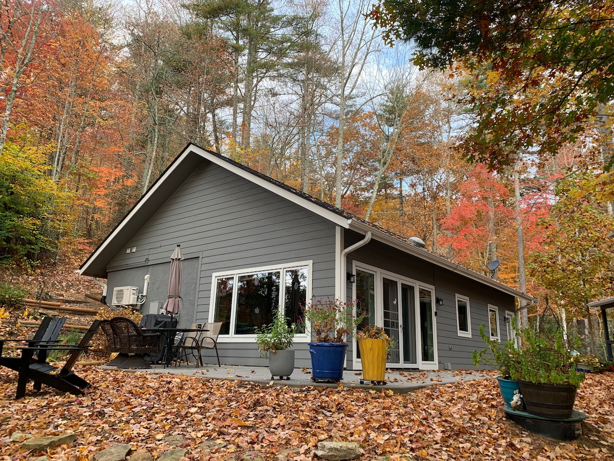坐落在寧靜的山脊上。 氛圍舒適。非常適合單身旅客或情侶入住。 在有遮蔽的門廊或有藤架的大露臺上放鬆身心時,聆聽潺潺流水聲。開車15分鐘即可抵達杜邦州立休閒森林或皮斯加國家森林。開車10分鐘即可抵達布雷瓦德市中心。 備有充足的廚房、W/D和咖啡吧。 躺在雙人躺椅或躺椅上放鬆身心。 客廳有WiFi、Roku電視和電壁爐。 Transylvania County有250多個瀑布。
