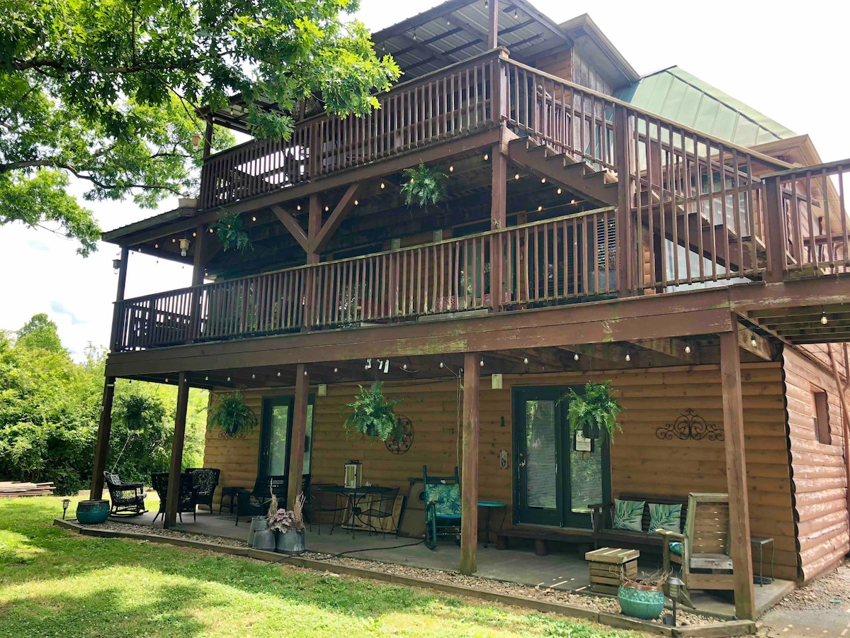 1英畝的私人祥和幸福! 全新65吋電視、床單、廚房用品、洗衣機/烘乾機、咖啡壺、咖啡、茶。 大量毛巾、大量/枕頭、毛毯/毯子、洗髮精、護髮素、香皂、按摩浴缸、熱水浴缸、有頂棚門廊、露臺、火坑等!您不必離開!雜貨送到家! 靠近酒莊、咖啡廳、餐廳,您可以步行,但感覺自己是獨自一人!幾分鐘內即可抵達凱德斯灣(Cades Cove)山脈!自行車步道、徒步旅行、泛舟和皮劃艇!折扣,是的