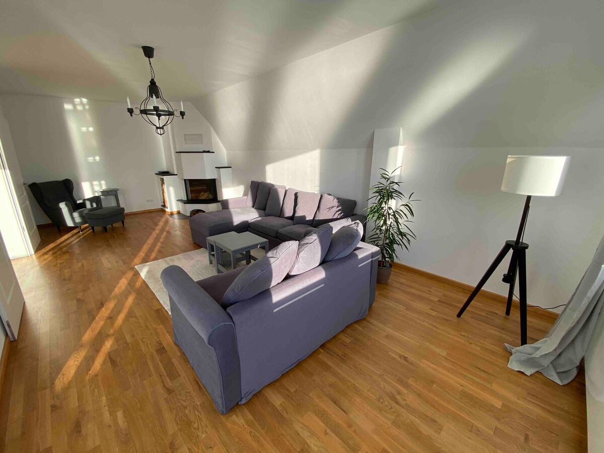Dachgeschoss Wohnung 20 Autominuten von Potsdam und Berlin und 30 Zugminuten vom BER entfernt. Großzügige, vollausgestattete Designküche*, Badezimmer mit Agape Vieques Badewanne und passendem Waschbecken * , Schlafzimmer mit 2,70m großem Bett * , Fitnessraum kann als zweiter Schlafbereich genutzt werden. Hier ist ein 1,80m Doppelbett*Beamer mit App Vorinstallation für NETFLIX, Disney + und Amazon Prime Login, Spielsachen, Supermarkt mit Bäcker und Fleischer Getränkemarkt*Badeseen&Wandern