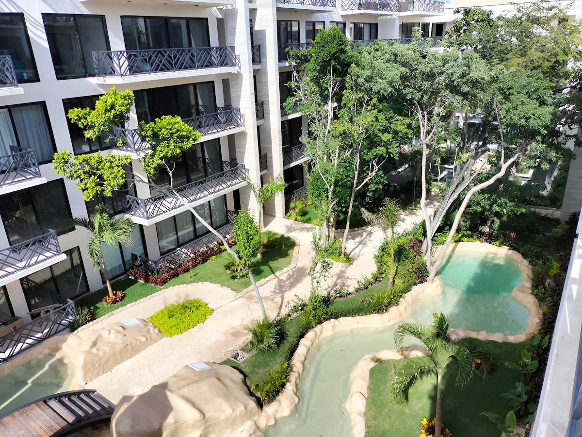 Stunning loft apartment with direct access to pools, near Tulum center and only a few minutes from the spectacular beach and Tulum beach clubs. Enjoy several stunning swimming pools, a roof top pool, sun beds, nice gym, 24/7 staff, strong A/C, elevator, fast Wifi (400 Mbps), blackout curtains, 55" smart TV, a fully equipped kitchen and private parking. Experience outdoor dining or just drinks with beautiful panoramic views at the roof top restaurant