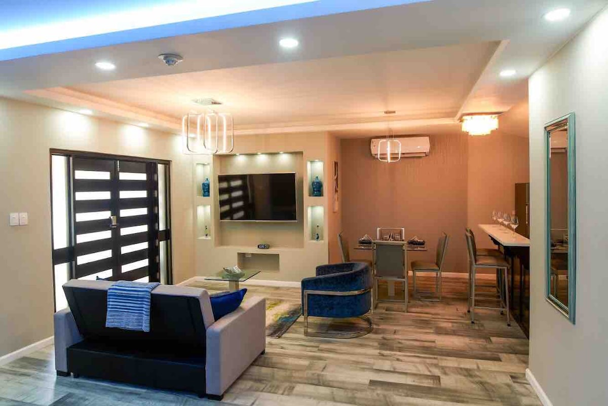 入住這間位處中心地段的房源,在這裡的時尚和舒適綠洲中放鬆身心。距離機場、Trincity商場和其他購物區僅7分鐘。非常適合商務旅客和情侶/朋友度假。 在我們的現代波西米亞主臥室中度假,配有高端設計師套房浴缸,或從我們的迷你葡萄酒賣場倒出您最喜愛的玻璃杯。設計有設備齊全的不鏽鋼廚房,可準備您最喜愛的菜餚。 在舒適的露臺上休息,在小型壁爐上烤零食。