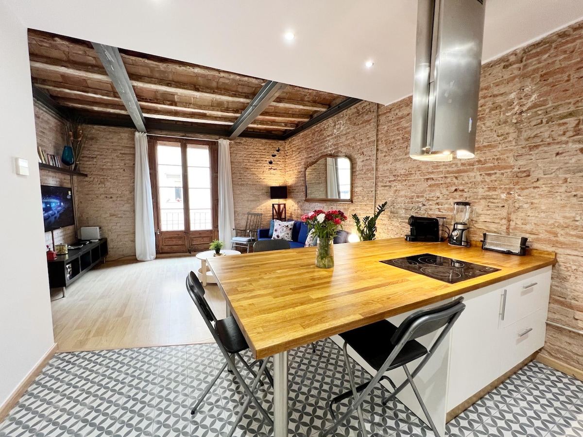 95平方公尺的寬敞明亮公寓,全面翻新,位於現代主義建築中。它保留了舊的元素,使「La Pepa」成為巴塞隆納一個非常特別、溫馨和獨特的空間:「trencadís」的外觀(高第和其他現代主義建築師在其作品中廣泛使用的建築元素)和露臺上的舊水壓瓷磚。 外露的木樑、高天花板和一些藝術裝飾家具