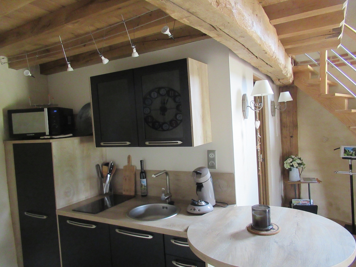 迷人的古老半木架面包烤箱,位於小溪邊,包括: - 帶有木柴壁爐的客廳, - 廚房, -樓上: -淋浴間/廁所,需爬梯子(見照片), - 臥室,配有一張 160x200 的床,可俯瞰小溪,需爬梯子進入(見照片), 臥室和浴室不相通。 花園、烤肉、私人停車場、含木柴 另一間小屋(石屋)距離 100 公尺
