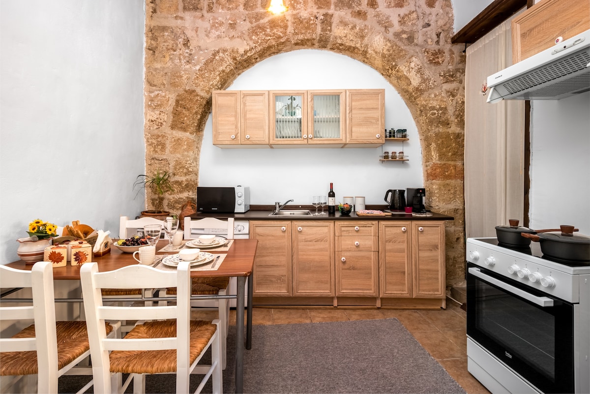 Ilios House Is ideally located right inside the medieval old town of Rhodes in a quiet and sun filled place, just a few meters away from the central port of Rhodes and about 100m away from the old town’s market place. The house was bought and renovate in 2005 under the provision of archaeological department of Rhodes because of it's historical value. Rebuilt with new modern appliances in the unique traditional style of the area because of the Surrounding by the Byzantine Church of Saint Fanourios ,the Temple of Panagia Bourgou and the Medieval Moat.The ground floor includes a living room with aged mosaic floor, comfortable kitchen with refrigerator ,microwave ,cooking area and a washing machine, coffee maker, toaster etc and an inspiring bathroom. The first floor is the place of the bedroom in which at least four persons can sleep comfortably. The house is fully equipped with all necessary kitchen utensils, towels , bedding ,hair dryer, iron, and boards, tv, dvd, wireless internet connection for your laptop. Is great for a couple and also for families with 2 adults & 2 - 3 kids,and for adults company or teenagers company. Just a few meters away from the building , is a place for free parking, a mini market and public playground as well many traditional Greek Tavernas and International restaurants, cafes and other entertainment places , museums etc. Also you can go daily on trips to other Dodecanese islands or to other beaches in Rhodes . Together with the Ilios Apartment next door we can accommodate up to 7 persons